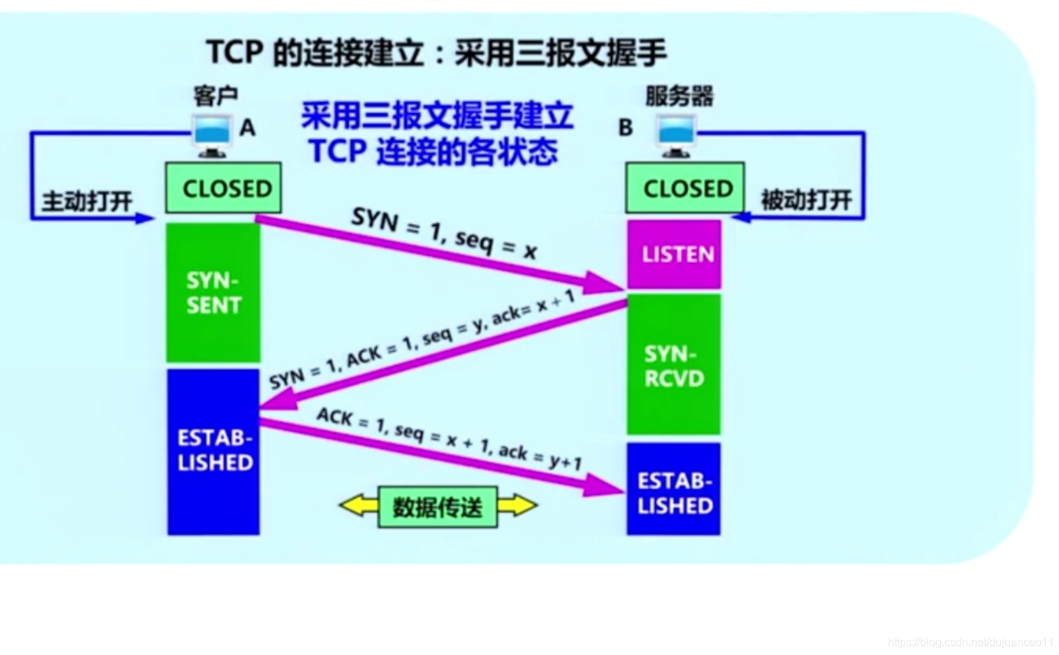 刚开始双方TCP进程都处于关闭状态(closed),客户主动打开连接,服务器被动打开连接,服务器处于收听状态(listen 状态),等待客户连接请求。