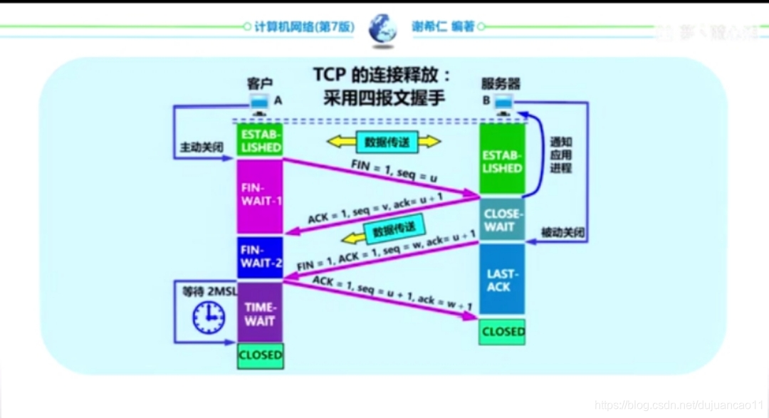 客户端在收到服务器的连接释放报文段后必须对其确认,ACK=1,ack=w+1,seq=u+1。